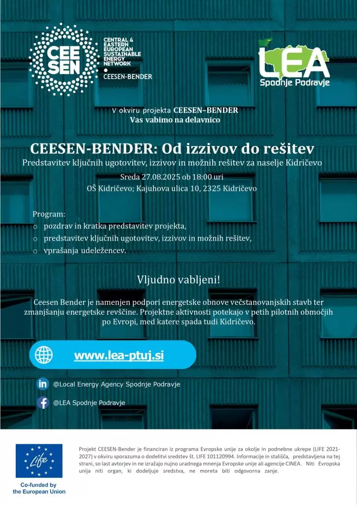 Projekt CEESEN-BENDER je namenjen podpori energetske obnove večstanovanjskih stavb ter zmanjšanju energetske revščine. Aktivnosti potekajo v petih pilotnih območjih po Evropi, med katerimi je tudi Kidričevo.